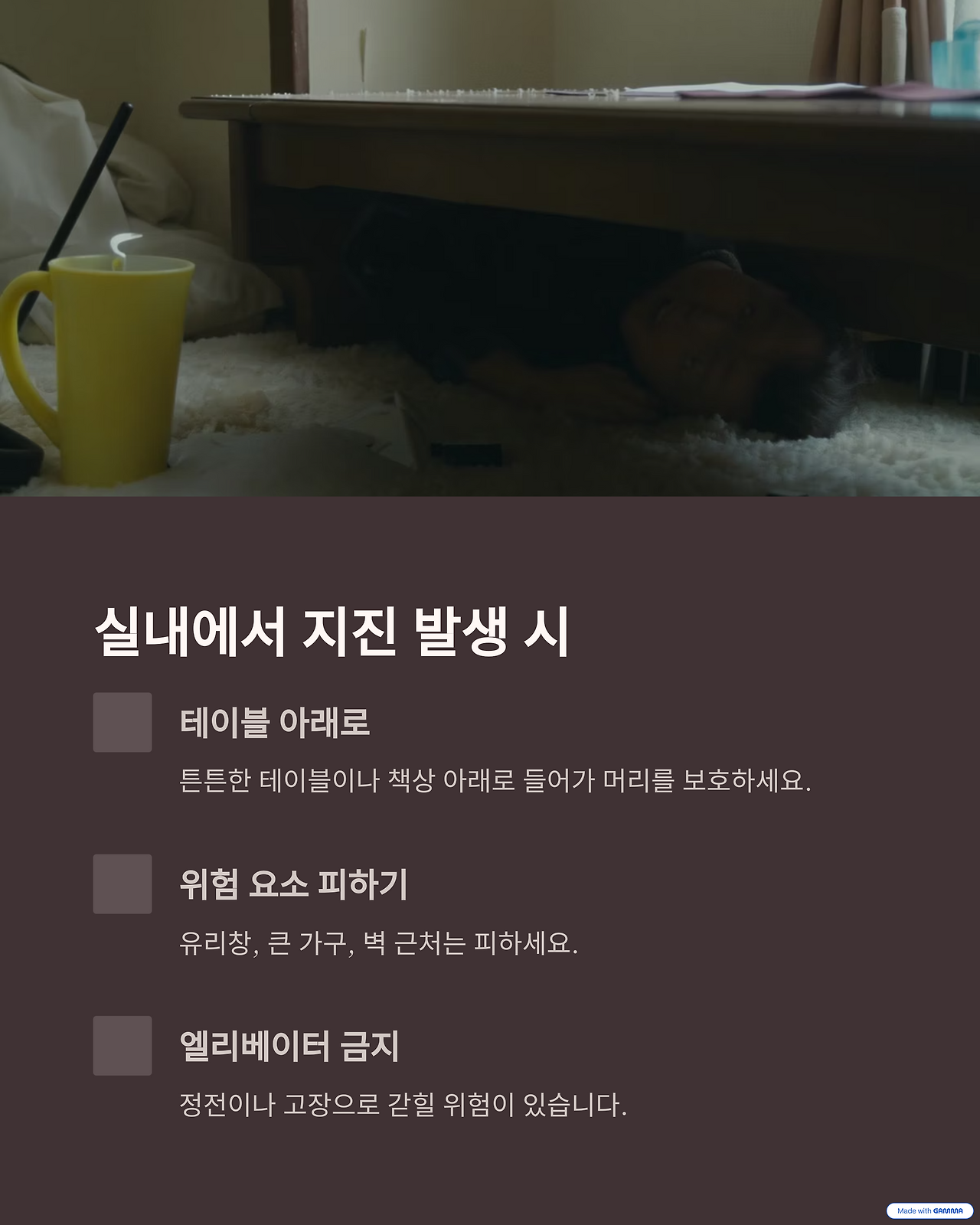 - 학교에서 지진: 책상 아래로 들어가 머리를 보호하고, 흔들림이 멈추면 운동장으로 이동.