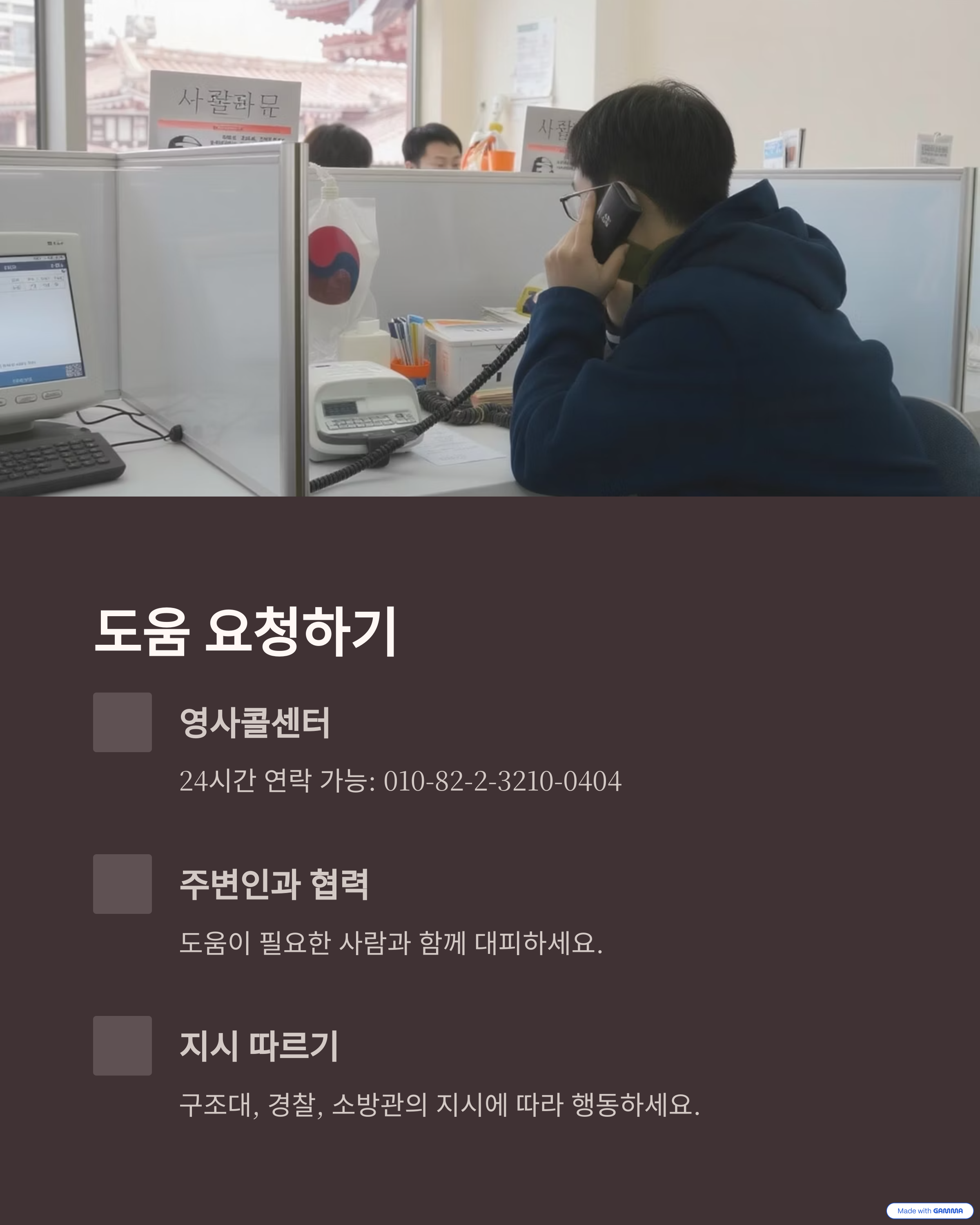 - 일본어가 익숙하지 않다면, 한국 외교부 영사콜센터(010-82-2-3210-0404)로 연락해 도움을 요청하세요