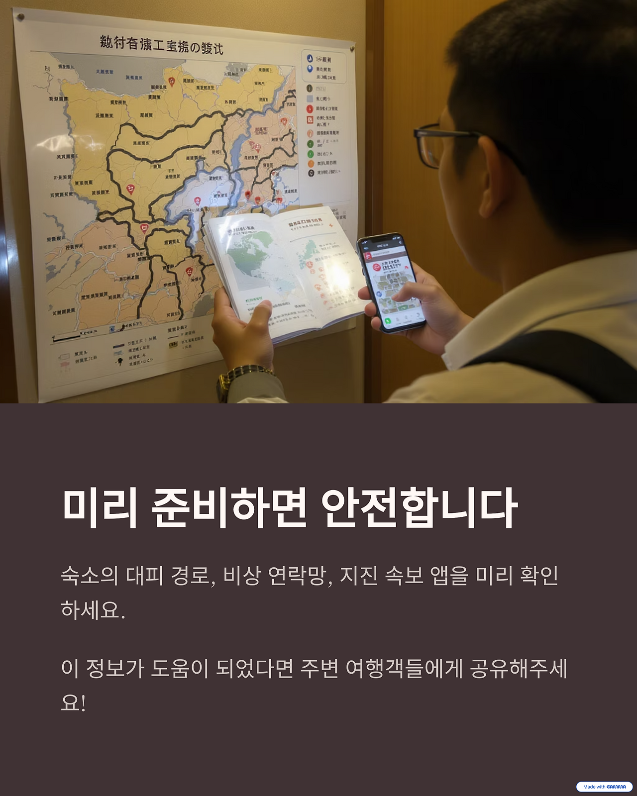 - 숙소의 대피 경로와 대피소 위치를 미리 확인하세요