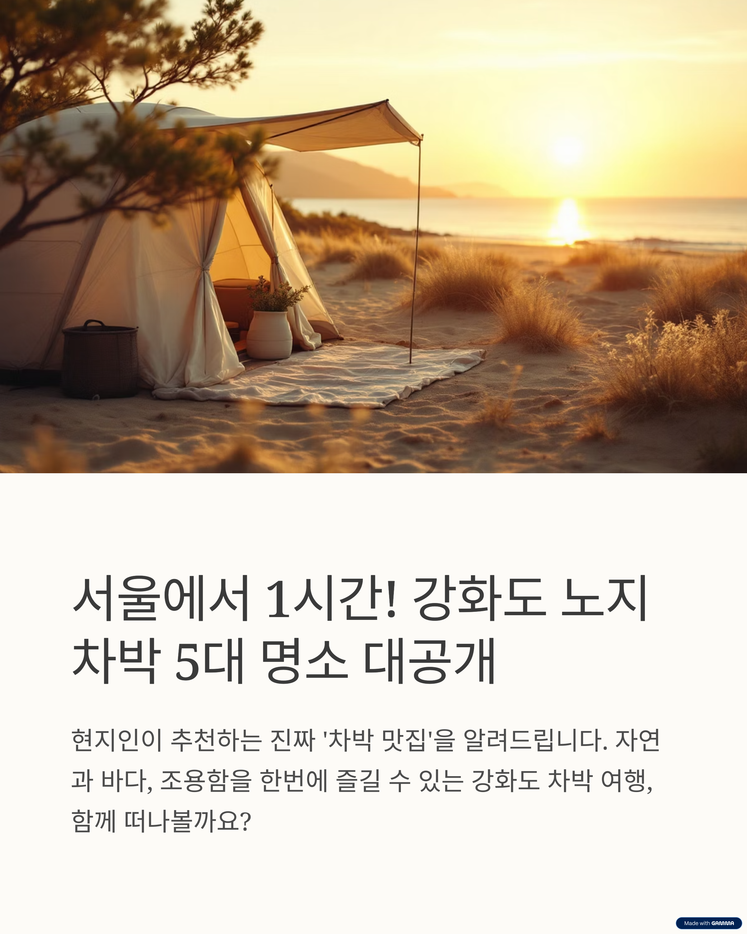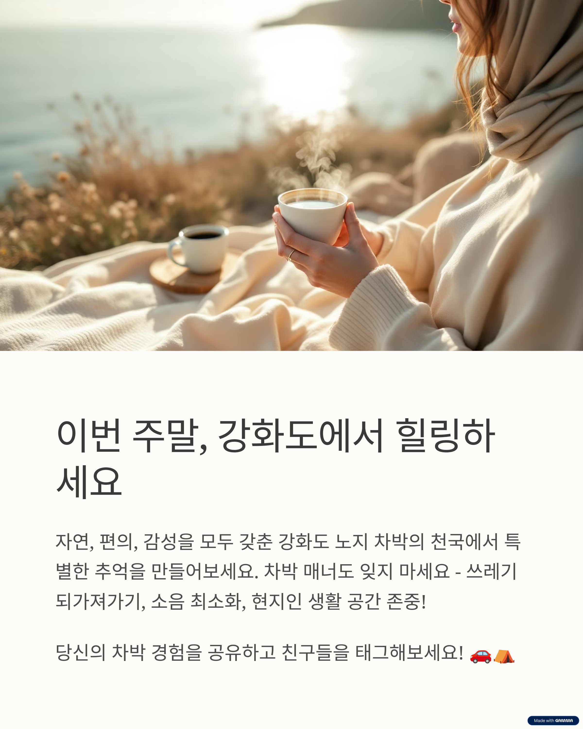 이번 주말, 현지인이 인정한 강화도 차박 핫플에서 일상의 스트레스를 날려보세요! 🚙💨 위 5곳 중 한 곳이라도 경험한다면 "강화도 차박, 여기가 진짜다!"라는 탄성이 나올 것입니다. 지금 바로 계획을 세우고 특별한 추억을 만드세요.