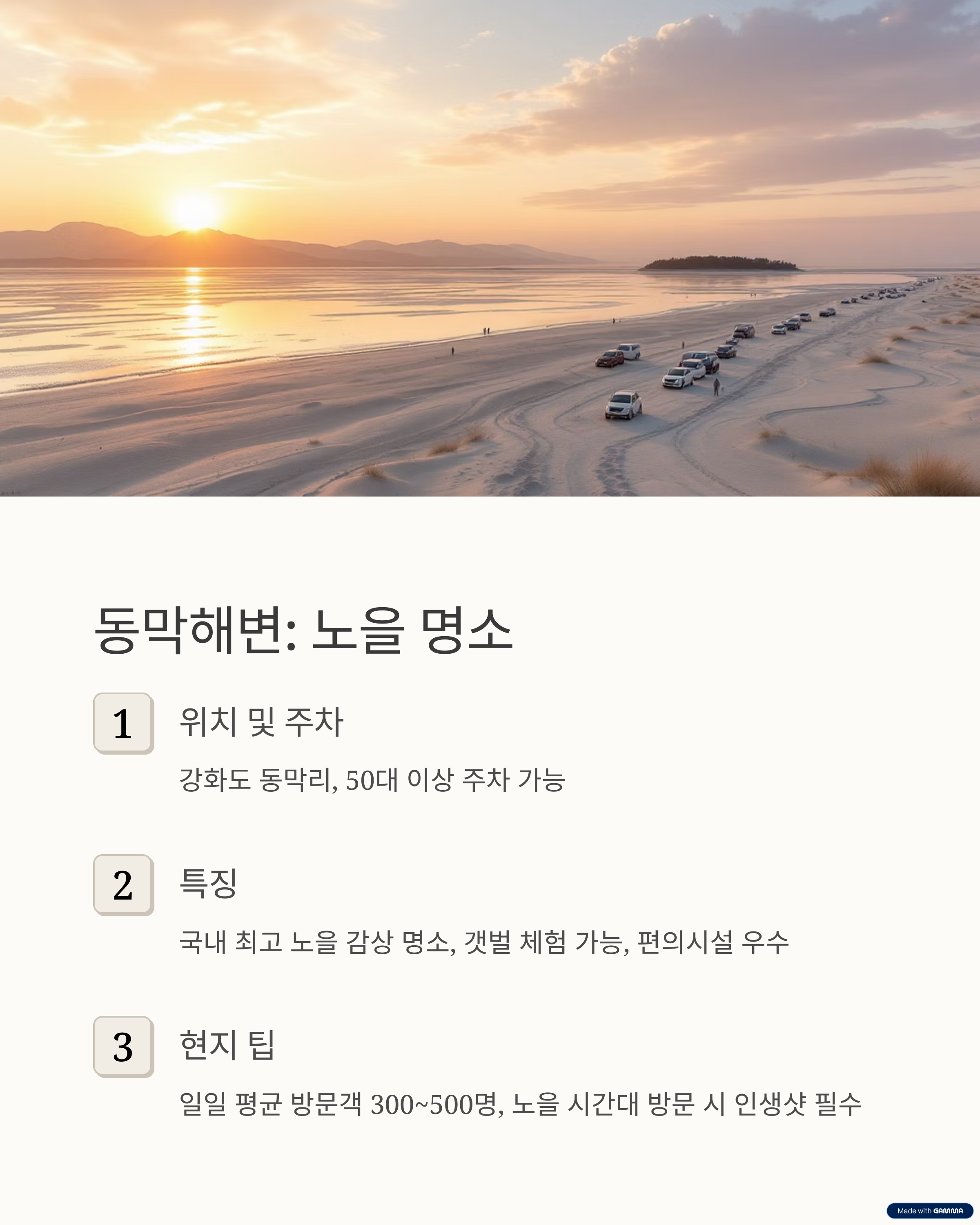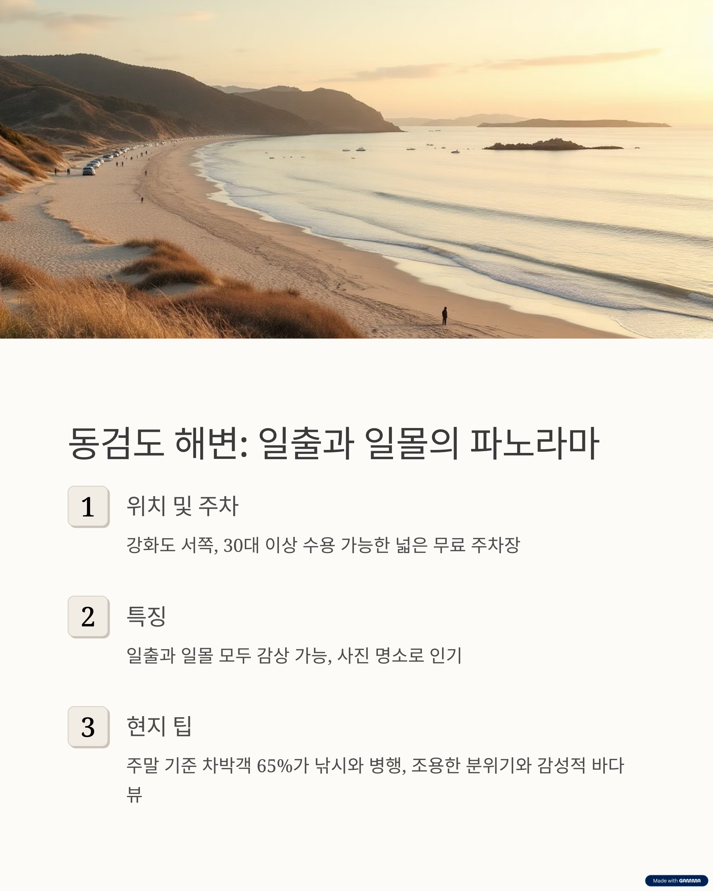 강화도 차박은 서울에서 1시간 거리라는 접근성과 서해의 장엄한 노을, 감성적인 바다뷰를 동시에 즐길 수 있어 수도권 차박족들에게 꾸준히 사랑받고 있습니다. 현지인들이 직접 검증한 노지 차박 핫플 5곳을 데이터와 함께 상세히 소개합니다. 특히 혼잡도, 주차 가능 대수, 편의 시설 등 실제 방문객 통계를 기반으로 핵심 정보를 전달해 드립니다.